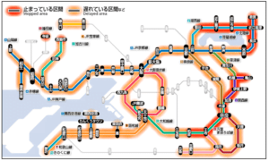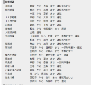 このように、殆どの区間が遅れています。(台風21号の影響)