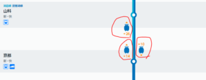 例えば、JR京都線の例ですが、車両マークの下にそれぞれ+26,+14,+10という表記が見えます。