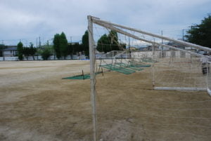 校庭では、サッカーゴールや仕切りが全て倒れていました。